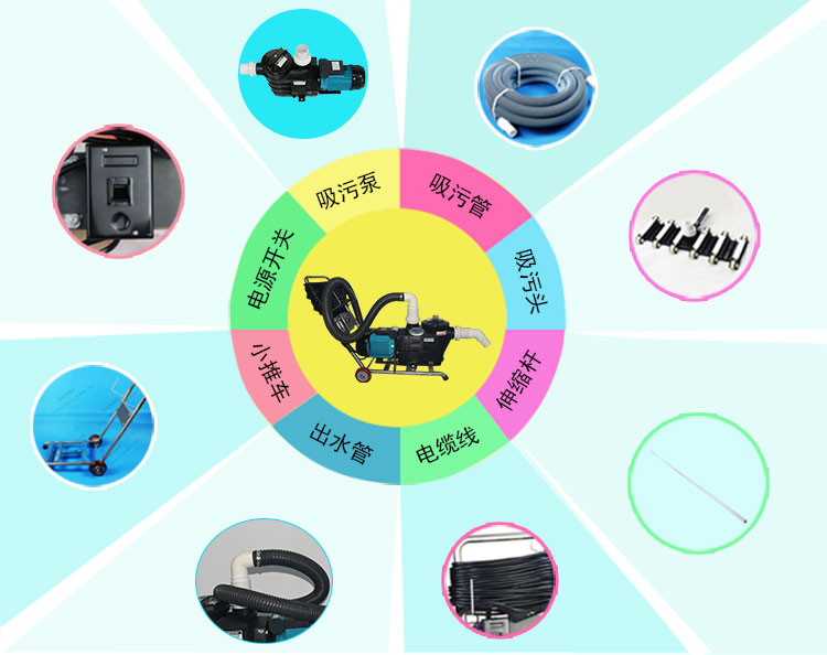 | 1.吸污泵; 2.不銹鋼推車; 3.泵體固定拉線; 4.開關; 5.電纜線; 6.出水接頭; 7.排污出水管; 8.透明蓋; 9.進水接頭; 10.進水鋼絲管; 11.吸污盤(不銹鋼); 12.吸盤拉繩穿孔; 13.透明蓋開關扳手; | ||