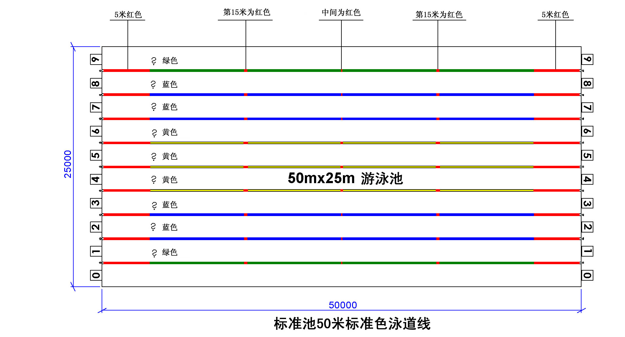 其他泳池泳道線展示(以下的這幾種只要記住一米為10個風車,分清顏色,計算一下就很容易了):