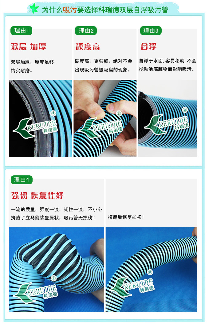 【優點】:雙層管,夠硬度,不會被吸扁;能自浮于水面容易移動,并且不會攪動池底的臟物而影響吸污效果。
